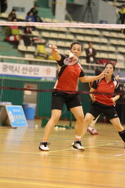 8일과 9일 전북 익산시 실내체육관에서 열린 제21회 문화체육관광부장관기 전국배드민턴대회에는 1200여 명의 배드민턴 동호인이 출전해 기량을 겨뤘다. 여성 복식조에 출전한 동호인 선수가 상대의 공격을 침착하게 받아넘기고 있다. 사진제공|전국배드민턴연합회