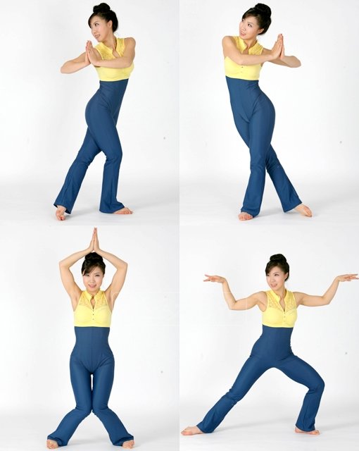 3. 양발을 어깨넓이로 벌리고 서서 가슴 앞에서 합장을 한다. 중심을 낮추며 양무릎을 붙이고 합장한 손은 머리 위로 들어올린다. 호흡을 내쉬며 허벅지와 괄약근을 강하게 수축시킨다. 10초 정지 5회 반복, 5초 정지 10회 반복.