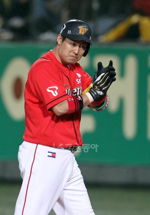 2011 프로야구 KIA타이거즈와 SK와이번스 준플레이오프 3차전 경기가 11일 광주무등경기장에서 열렸다. 6회초 1사 만루 SK 안치용이 2타점 적시타를 친 후 박수를 치고 있다.