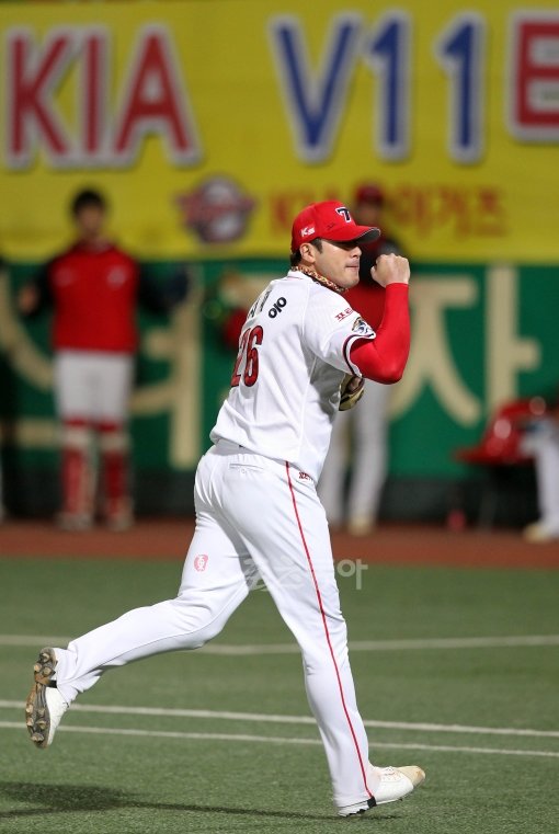2011 프로야구 KIA타이거즈와 SK와이번스 준플레이오프 3차전 경기가 11일 광주무등경기장에서 열렸다. 5회초 2사 1루 SK 정근우 타석 때 1루주자 임훈이 2루 도루에 실패하자 KIA 서재응이 주먹을 쥐며 기뻐하고 있다.