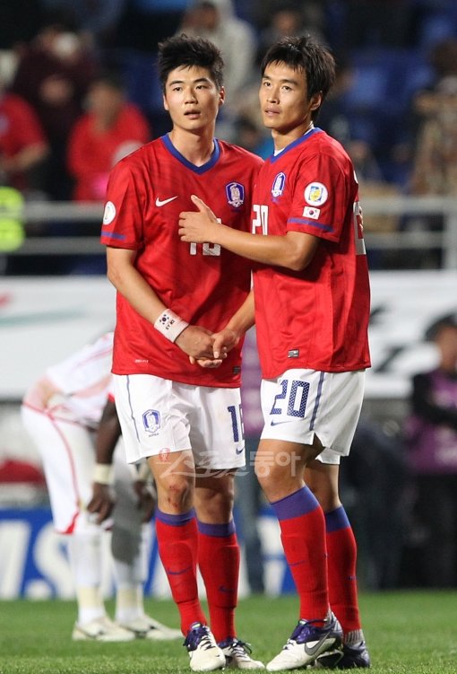 10일 수원월드컵경기장에서 열린 2014년 브라질 월드컵 아시아지역 3차 예선전 한국과 아랍에미리트연합(UAE)와의 경기에서 2대 1로 한국이 승리했다. 경기가 끝난 후 기성용과 이동국이 승리의 악수를 나누고 있다.