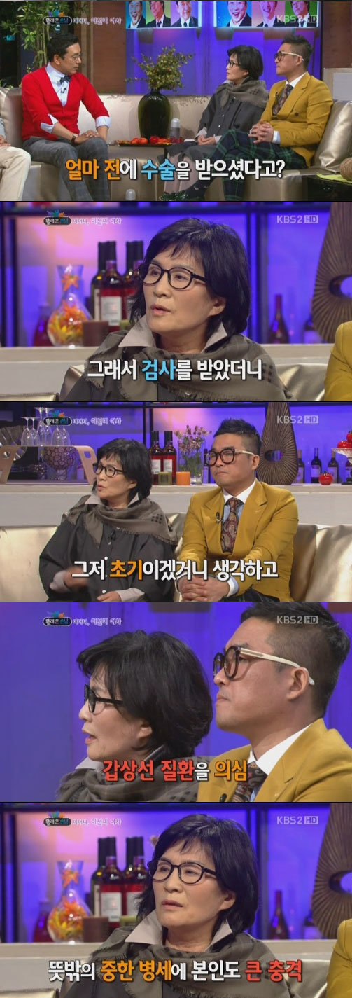 이어 “난 초기암이라고 생각해 퇴원해 집으로 돌아와 김치를 담궜다. 그러나 수술 후 2주 뒤가 지난 후 자세히 알아보니 갑상선암 말기였다”며 “한쪽만 수술해도 될 것을 양쪽을 다했고 임파선까지 제거했다”고 털어놨다.