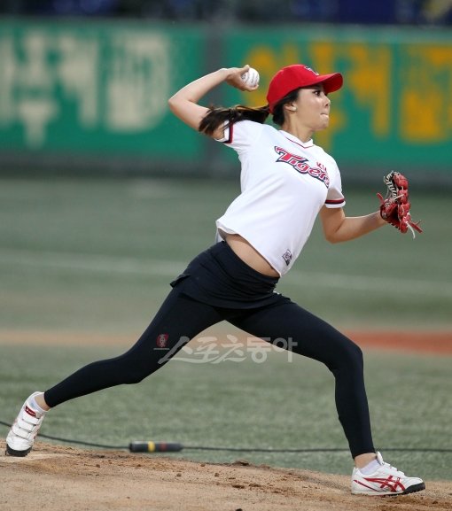 2011 프로야구 KIA 타이거즈와 SK 와이번스 준플레이오프 3차전 경기가 11일 광주무등경기장에서 열렸다. 경기 전 방송인 이수정이 시구를 하고 있다.