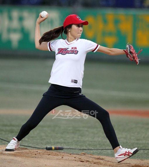 2011 프로야구 KIA 타이거즈와 SK 와이번스 준플레이오프 3차전 경기가 11일 광주무등경기장에서 열렸다. 경기 전 방송인 이수정이 시구를 하고 있다.