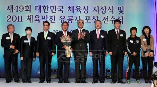 19일 오후 서울 중구 소공동 롯데호텔 크리스탈볼룸에서 열린 제49회 대한민국체육상 시상식에서 각 부문 수상자들이 최광식 문화체육관광부 장관과 기념 촬영을 하고 있다. 특수체육상 김창환, 극복상 김임연, 진흥상 유길호, 공로상 김종욱, 최광식 장관, 연구상 안양옥, 지도상 장경수, 경기상 2010 U-17 여자축구국가대표팀 전한울, 김태희(왼쪽부터)