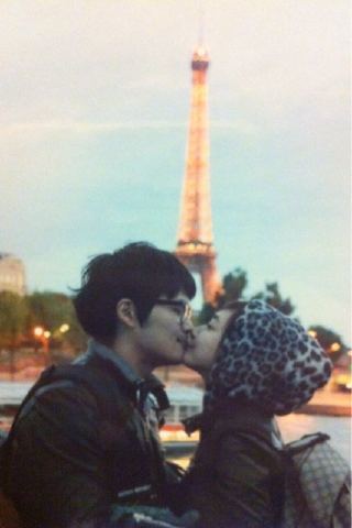 진재영은 프랑스 파리의 에펠탑을 배경으로 남편과 입을 맞추며 로맨틱한 분위기를 연출했다.