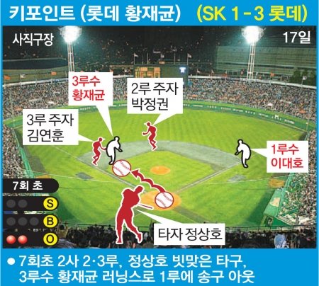 그러나 PO 2차전은 ‘롯데가 수비에서 SK를 이겼다’고 해도 과언이 아니었는데 압권은 황재균의 7회 수비였다. 롯데가 3-1로 쫓기던 1사 2·3루. SK 김강민의 땅볼을 잡아내 주자를 묶어놓고