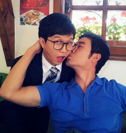 엄태웅이 개그맨 박성광과 코믹한 키스장면을 공개했다. 박성광은 18일 미투데이(@skpark3618)에 엄태웅과 찍은 사진을 공개했다. 사진에서 엄태웅은 박성광의 볼에 뽀뽀를 하고 있다. 박성광은 “절친인 태웅이 형과 영화 촬영 중”이라며 “여러분 부럽죠? 태웅 형의 성적 취향을 보세요. 남자? 영화 대박나세요”라고 썼다. 눈을 감고 박성광의 볼에 입을 맞추는 엄태웅의 모습에 누리꾼들은 깜짝 놀라고 있다. 특히 반팔 셔츠를 입어 드러난 엄태웅의 팔근육도 눈길을 끈다. 한 누리꾼은 “오빠들 정말 사랑하는 사이인가요”라고 했고 또 다른 누리꾼은 “은근히 어울리는 커플이다”고 했다. 엄태웅은 정려원과 영화 ‘네버엔딩 스토리’를 촬영하고 있다.