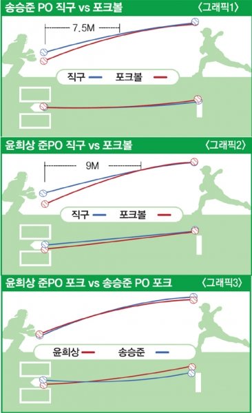 송승준의 포크볼은 구속면에서 윤희상보다 다소 떨어지지만, 공이 변하는 시점은 더 홈플레이트쪽에 가깝다. <그래픽1>에서 보듯 PO2차전에서 송승준의 포크볼은 직구와 유사한 궤적을 유지하다가 홈플레이트 앞 7.5m지점에서 급격히 가라앉았다.