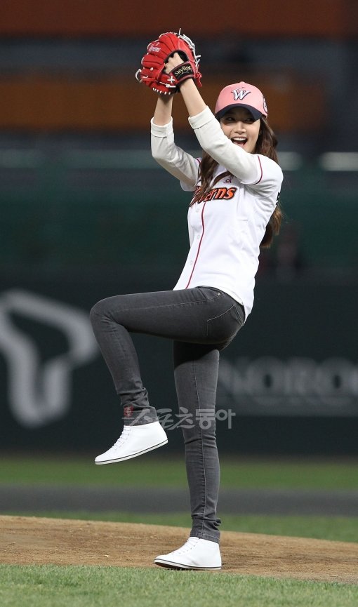 19일 저녁 인천 문학야구장에서 열린 SK와 롯데의 프로야구 플레이오프 3차전이 열렸다. 연기자 박민영이 시구를 하고 있다.