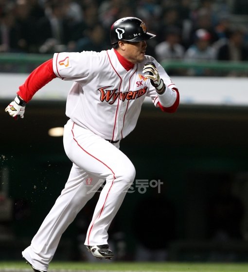 19일 저녁 인천 문학야구장에서 열린 SK와 롯데의 프로야구 플레이오프 3차전이 열렸다. 4회말 1사 1,3루 타석에서 1타점 적시타를 친 SK 최동수가 1루를 향해 전력질주하고 있다.
