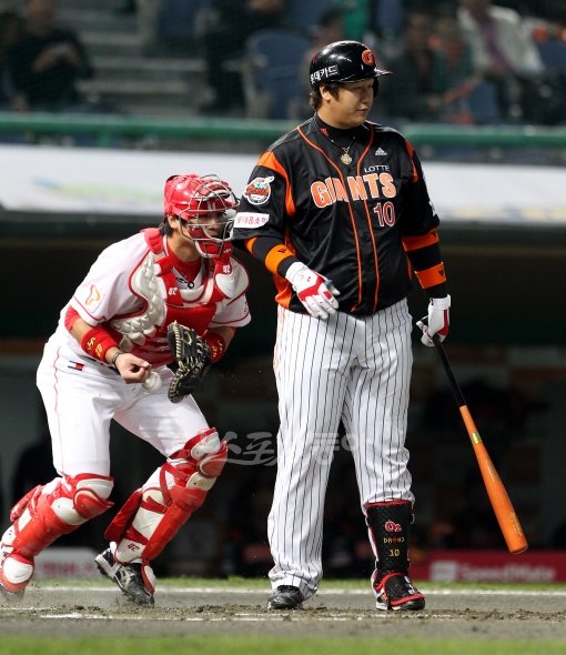 19일 저녁 인천 문학야구장에서 열린 SK와 롯데의 프로야구 플레이오프 3차전이 열렸다. 1회초 2사 1루 롯데 이대호 타석때 1루 주자 전준우가 2루 도루를 시도하자 SK 포수 정상호가 2루 견제 도중 볼을 놓치고 있다.