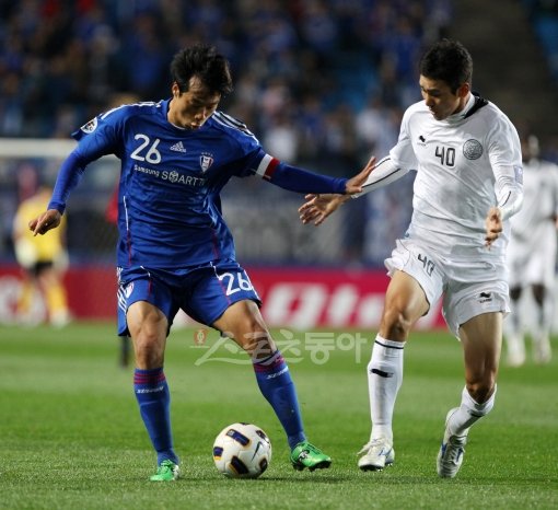 19일 오후 수원월드컵경기장에서 AFC 챔스리그 4강 1차전 수원삼성(대한민국)과 알 사드(카타르)의 경기가 열렸다. 삼성 염기훈과 알사드 이정수가 볼을 다투고 있다.