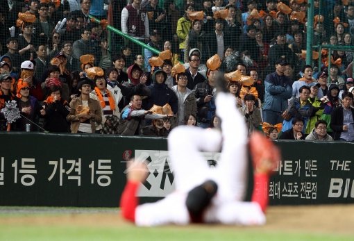 19일 저녁 인천 문학야구장에서 열린 SK와 롯데의 프로야구 플레이오프 3차전이 열렸다. 8회초 1사 1루 롯데 타자 홍성흔을 헛스윙 삼진으로 잡은 SK 투수 박희수가 포수 송구때 마운드에서 넘어지며 관중들과 함께 2루를 바라보고 있다.