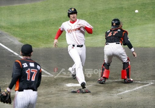 2011 프로야구 SK와이번스 대 롯데자이언츠의 플레이오프 3차전 경기가 19일 인천 문학야구장에서 열렸다. 8회말 2사 만루 SK 김강민 중전 안타 때 2루주자 박정권이 홈에서 세이프 되고 있다.
