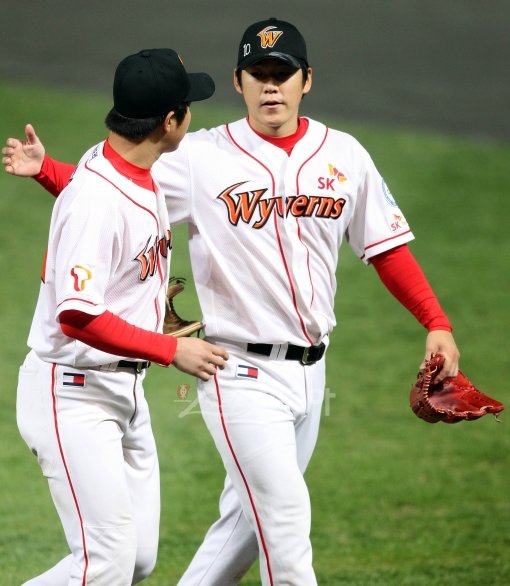 8회초 롯데의 공격을 무실점으로 막은 SK 박희수가 최정과 이야기하며 덕아웃으로 걸어가고 있다.