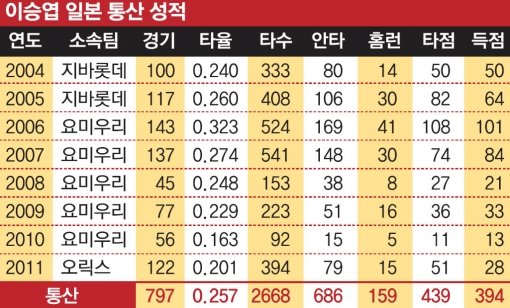 이승엽은 오릭스와 2년계약을 하면서 절치부심했지만 올시즌에도 타율 0.201, 15홈런, 51타점에 그치자 계약기간 1년을 남기고 일본생활을 청산하기로 결심했다. 통산 797경기에 출장해 159홈런(타율 0.257, 439타점)의 족적을 남긴 것으로 일본생활을 마무리했다.