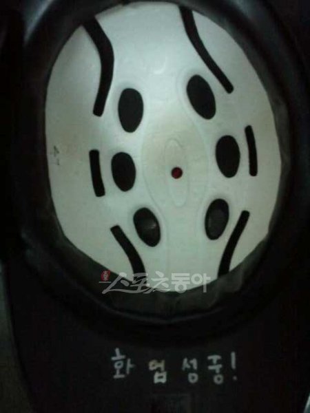 누구의 것인지, 눈치 채셨다고요? 맞습니다. 왼쪽에 희미하게 ‘47’이라고 등번호가 적혀 있듯, 강민호의 헬멧입니다. 강민호는 시간 날 때 종종 절을 찾아 마음을 가다듬곤 합니다. PO에서의 각오가 느껴지는 헬멧입니다.