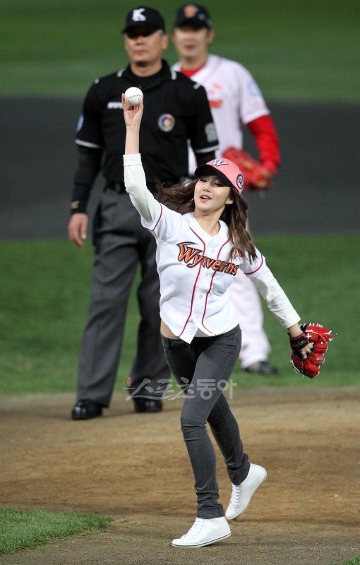 경기 전 탤런트 박민영이 시구를 하고 있다.