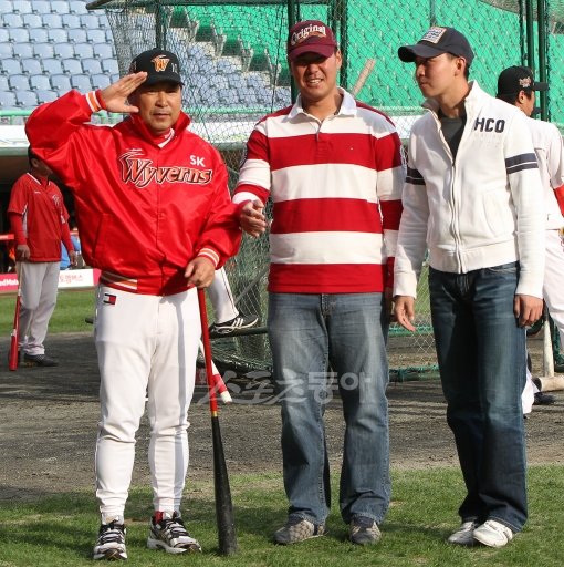 취재진을 향해 이만수 감독대행이 양 선수에게 거수경례를 해보라며 주문하고 있다.