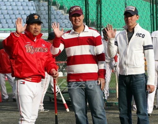 취재진을 향해 이만수 감독대행과 양 선수가 인사를 하고 있다.