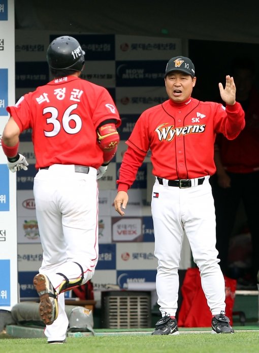 23일 오후 부산 사직야구장에서 열린 2011프로야구 롯데와 SK의 플레이오프 5차전에서 SK 박정권이 4회초 1사 1루때 홈런을 치고 홈인 한 후 덕아웃에서 이만수 감독의 축하를 받고 있다.