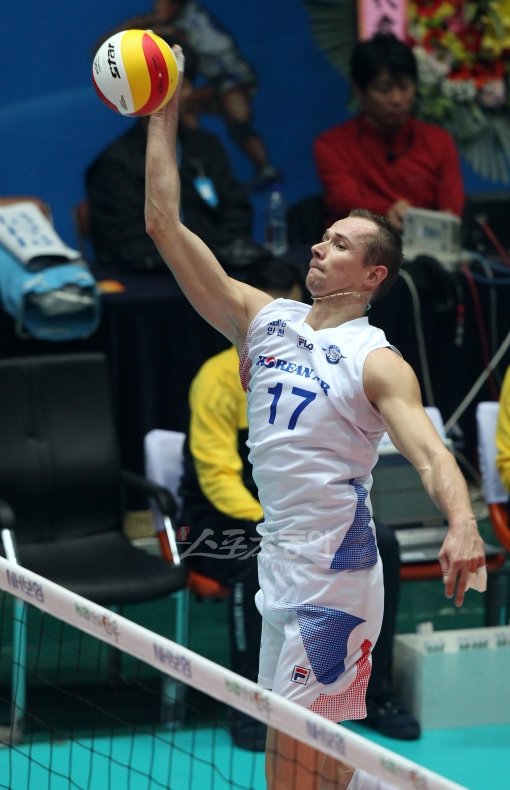 23일 오후 경기 인천도원시립체육관에서 열린 프로배구 2011 ~ 2012 V-리그 대한항공과 KEPCO45의 경기에서 대한항공 마틴이 가볍게 공을 넘기고 있다.