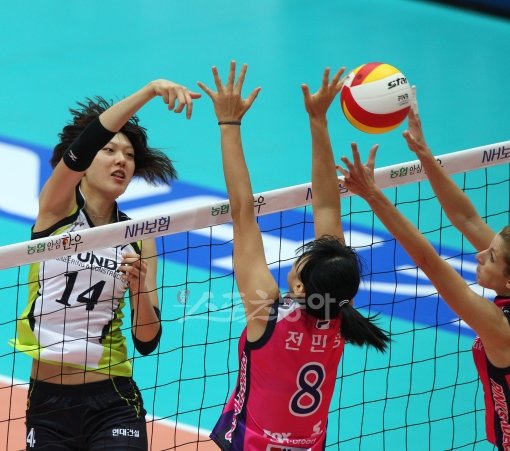 23일 오후 경기 인천도원시립체육관에서 열린 프로배구 2011 ~ 2012 V-리그 흥국생명과 현대건설의 경기에서 현대건설 양효진이 흥국생명 전민정과 미아의 블로킹 사이로 공격을 하고 있다.
