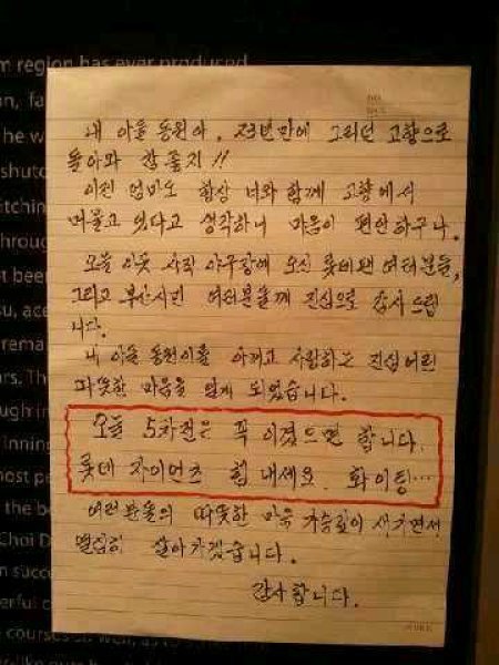 최동원 모친이 PO 5차전을 앞두고 사직구장 박물관에 남긴 글.