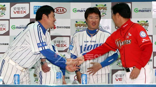 SK 이만수 감독대행(오른쪽)이 24일 미디어데이를 마친 뒤 삼성 진갑용(왼쪽) 최형우를 격려하며 선전을 다짐하고 있다.대구 | 박화용 기자 inphoto@donga.com 트위터 @seven7sola