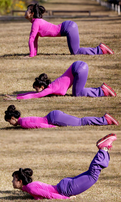 1. 고양이 자세로 엎드려 양팔을 어깨넓이로, 양 무릎을 골반넓이로 벌리고 고개를 들어 하늘을 바라본다. 등을 세우며 고개를 숙여 단전을 바라본다. 복식호흡을 하면서 골반 저근육 수축운동을 병행한다. 10초 정지, 5회 반복.