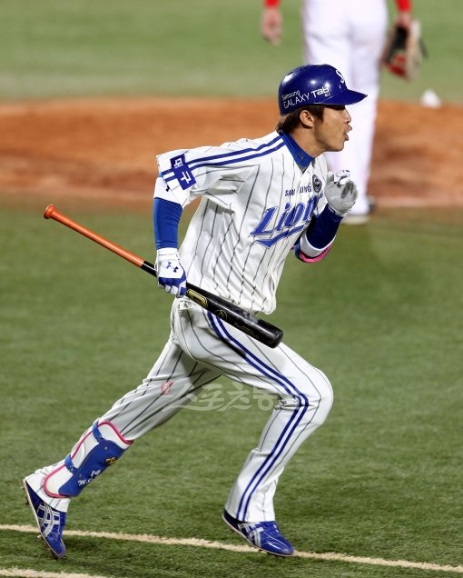 25일 저녁 대구 시민실내체육관에서 열린 2011프로야구 삼성과 SK의 한국시리즈 1차전에서 삼성 신명철이 7회말 무사 만루 타석에서 2루수 플라이를 친 후 SK 2루수 정근우의 실책으로 덕아웃으로 들어가다 1루로 전력 질주하고 있다. 대구ㅣ박화용 기자 inphoto@donga.com 트위터 @seven7sola