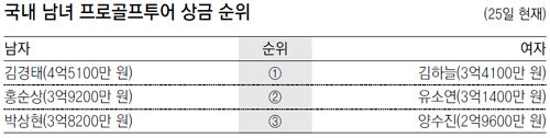 27일 인천 스카이72GC 하늘코스에서 시작하는 한국여자프로골프(KLPGA)투어 마지막 메이저 대회인 KB금융 스타챔피언십의 우승 상금은 1억4000만 원이나 된다. 올 시즌 유일하게 2승을 거두며 상금 선두에 나선 김하늘(BC카드)과 5위 정연주(CJ오쇼핑)의 차이가 8000만 원밖에 되지 않아 우승만 하면 단번에 상금 순위표 맨 앞에 이름을 올릴 수도 있다. 시즌 막바지에 접어든 KLPGA투어 상금 여왕 경쟁이 최대 분수령을 맞게 됐다.
