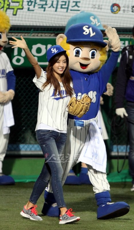 26일 저녁 대구 시민실내체육관에서 열린 2011프로야구 삼성과 SK의 한국시리즈 2차전에서 연기자 박한별이 시구자로 나와 관중들에게 인사를 하고 있다.