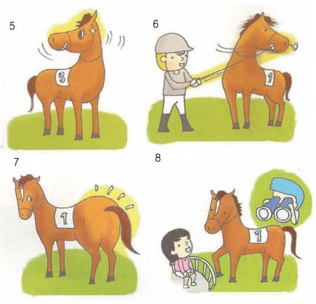 “예시장에서는 마필관리사가 고삐를 잡고 말의 보행을 이끌게 되지. 이때 고삐를 가끔 옆으로 돌리거나 밑으로 내리면서 당기려는 말들이 있다네. 초보자들은 이런 모습을 보며 ‘아, 저 말은 오늘 기수가 다루기 힘들겠구나’싶겠지만 사실은 반대일세. 최고의 컨디션을 보이고 있다는 증거이지.”