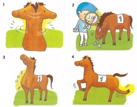“암말은 수말에 비해 땀의 양이 적다네. 따라서 암말이 흥분한 듯한 행동을 보이면서 땀에 흠뻑 젖어 있다면 경계할 필요가 있어. 수말의 경우에는 복부와 뒷다리 사이에 땀이 흐르기도 한다네.”