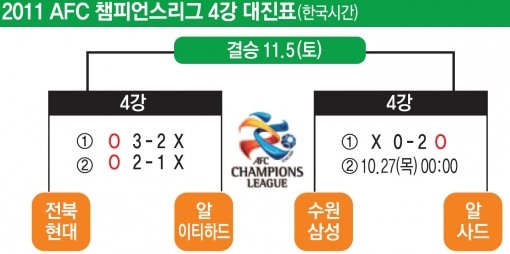 전북 현대는 26일 전주월드컵경기장에서 열린 알 이티하드(사우디아라비아)와의 2011 아시아축구연맹(AFC) 챔피언스리그 4강 2차전에서 2-1로 승리, 1·2차전 합계 5-3으로 결승에 올랐다. 전북은 2006년 이후 5년 만에 정상탈환을 노린다. 지난 주말 K리그 정규리그 1위를 확정, 챔피언결정전에 직행한 전북은 올 시즌 목표한 두 개 대회 모두 정상 문턱에 올랐다.