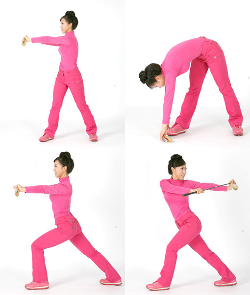 3. 다리를 앞뒤로 벌리고 서서 중심을 낮추며 왼쪽 무릎은 굽히고 오른쪽 다리는 뒤로 쭉 편다. 가슴 앞에서 클럽을 잡고 숨을 들이마시며 상체를 바로 세운다.