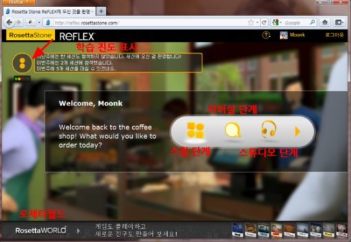 리플렉스의 또 하나의 특징은 다른 사용자들과 게임하면서 영어를 배울 수 있는 ‘로제타월드’가 제공된다는 점이다. 로제타월드는 20여 가지 다양한 게임을 한국 사용자는 물론 다른 나라 사용자와 서로 영어로 말하고 쓰며 즐길 수 있는 놀이형 학습 서비스다. 영어 학습을 너머 사교의 장으로 활용할 수 있어 자칫 지루해질 수 있는 어학 학습에 활력을 불어 넣는다.