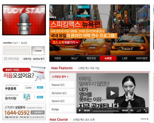 로제타스톤과 더불어 최근 들어 사용자들로부터 좋은 평가를 받고 있는 스피킹맥스(SpeakingMax)는 일상적인 회화 학습법과 차별화된 방식으로 흥미를 더한다. 별도의 프로그램을 설치하지 않고 인터넷을 통해 온라인으로 학습이 진행된다. 미국 아이비리그 8개 대학을 실제로 탐방, 방문하여 미국인들과 실제로 대화하는 모습을 촬영하고 이를 학습 창에 도입했다. 촬영 동영상 용량 만도 약 4TB(테라바이트, 약 4,000GB), 제작 기간도 꼬박 3년이 걸린 야심한 프로젝트였다.