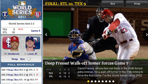 세인트루이스는 28일(이하 한국시간) 세인트루이스의 부쉬 스타디움에서 열린 텍사스 레인저스와의 2011 월드시리즈 6차전에서 11회 말 터진 데이빗 프리즈의 끝내기 1점 홈런에 힘입어 텍사스를 10-9로 누르고 3승 3패 동률을 이뤘다.