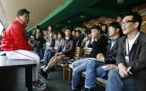 SK 이만수 감독대행이 28일 인천 문학구장에서 열리는 한국시리즈 3차전 삼성 라이온즈와 SK 와이번스의 경기 전에 취재진과 이야기를 하고 있다.