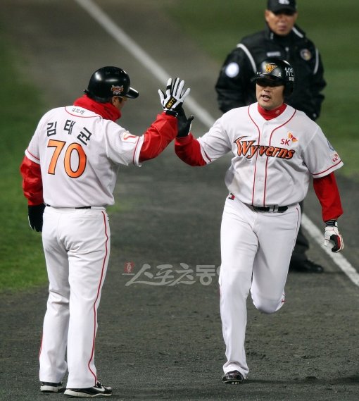 5회말 SK 공격, 1사 무주자 상황에서 SK 최동수가 솔로홈런을 날린 후 그라운드를 돌며 김태균 코치와 하이파이브를 하고 있다.