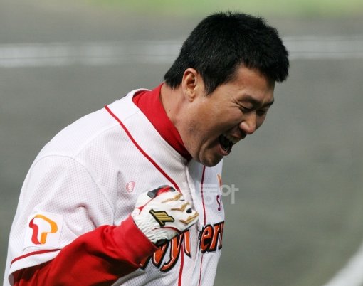 5회말 SK 공격, 1사 무주자 상황에서 SK 최동수가 솔로홈런을 날린 후 그라운드를 돌며 환호하고 있다.