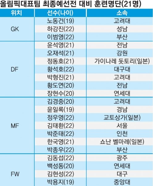 올림픽대표팀 홍명보 감독은 다음달 4일부터 경남 남해에서 실시하는 전지훈련에 참가할 21명의 태극전사 명단을 확정, 28일 발표했다. 이달 7일 열렸던 우즈베키스탄과의 평가전에 나섰던 선수들이 주축을 이룬다.