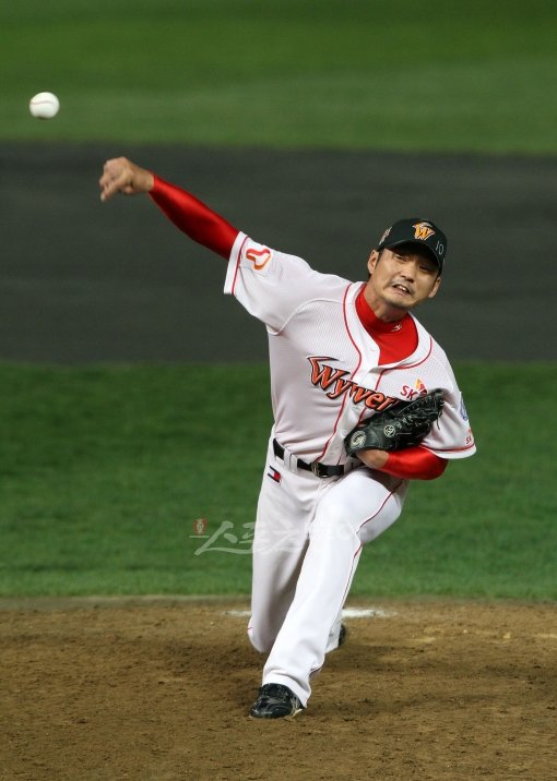 한국시리즈 3차전 삼성 라이온즈와 SK 와이번스의 경기가 28일 인천 문학구장에서 열렸다. SK 구원투수 엄정욱이 역투하고 있다.