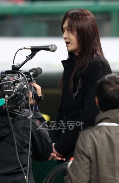 한국시리즈 3차전 삼성 라이온즈와 SK 와이번스의 경기가 28일 인천 문학구장에서 열렸다. 가수 김경호가 애국가를 부르고 있다. 문학 | 국경원 기자 onecut@donga.com 트위터 @k1isonecut