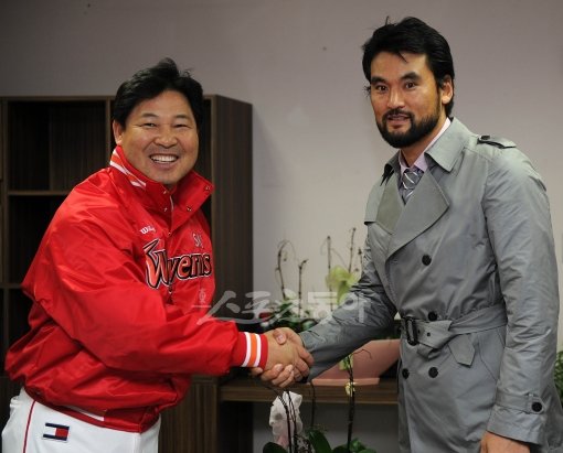 박찬호는 2012년 한국프로야구 마운드에 설 수 있을까. 28일 문학 3차전을 앞두고 경기장을 찾은 박찬호(오른쪽)가 SK 이만수 감독대행을 찾아 인사한 뒤 악수하고 있다. 문학 | 임진환 기자 photolim@donga.com 트위터 @binyfafa