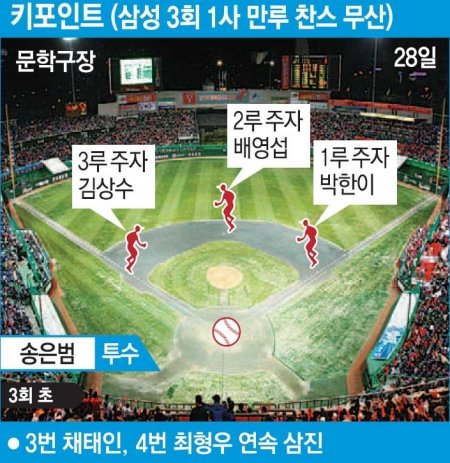 1사후 9번타자 김상수가 우전안타로 출루한 뒤 2루도루에 성공했고, 1번타자 배영섭이 중전안타 후 도루에 성공하며 1사 1·3루의 찬스를 잡았다. 이어 박한이의 볼넷으로 1사만루. 그러나 3번타자 채태인과 4번타자 최형우가 송은범에게 연속 삼진으로 물러나면서 찬물을 끼얹고 말았다.