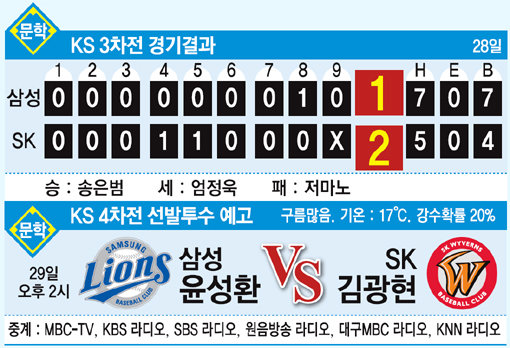 SK는 28일 문학구장에서 열린 2011 프로야구 한국시리즈(KS) 3차전에서 마운드의 이어던지기와 솔로홈런 2방으로 2-1로 짜릿한 승리를 거뒀다.